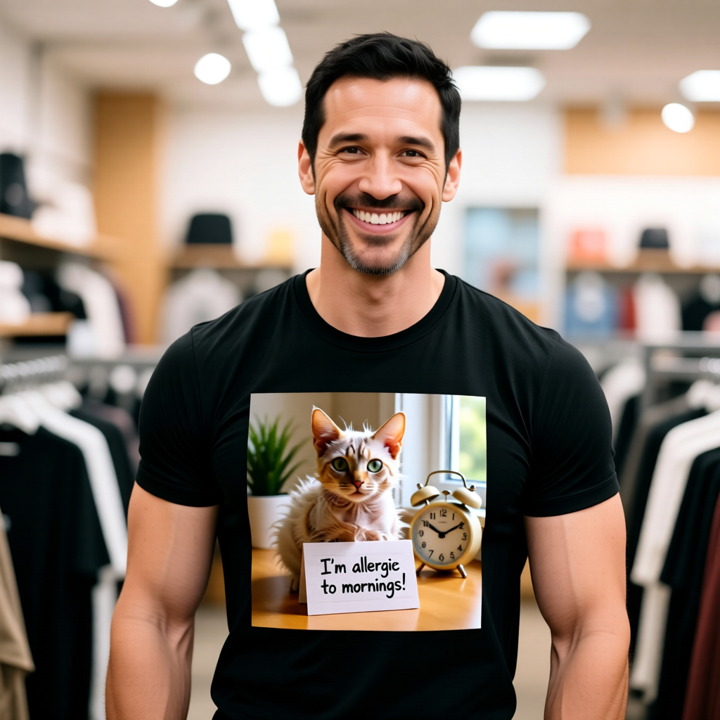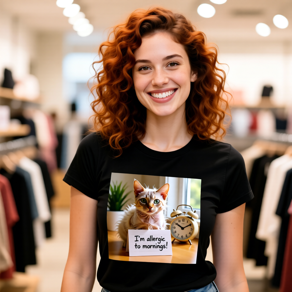 Not a morning person? Neither is this cat! This I'm Allergic to Mornings t-shirt features a panicked feline clutching a lined note with the ultimate declaration: "I'm allergic to mornings!" It's the perfect shirt for anyone who hits snooze more times than they'd like to admit.