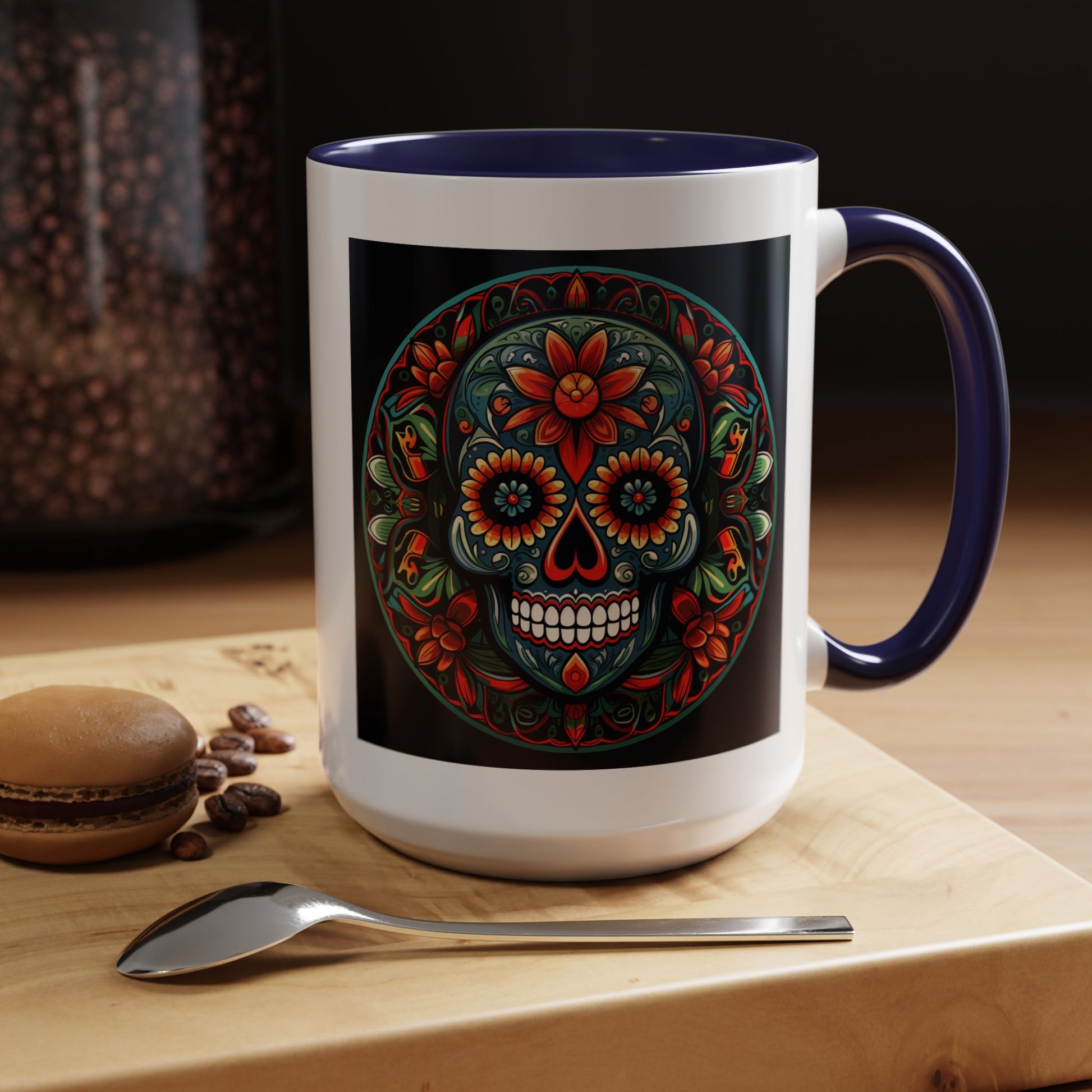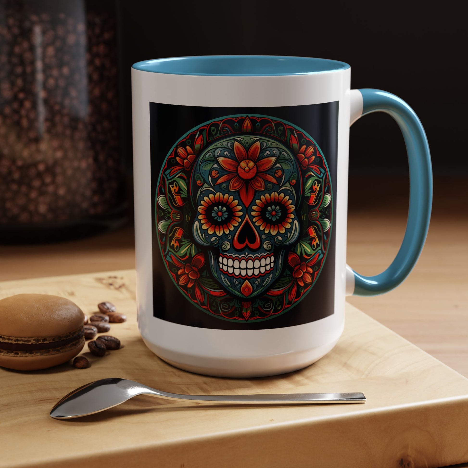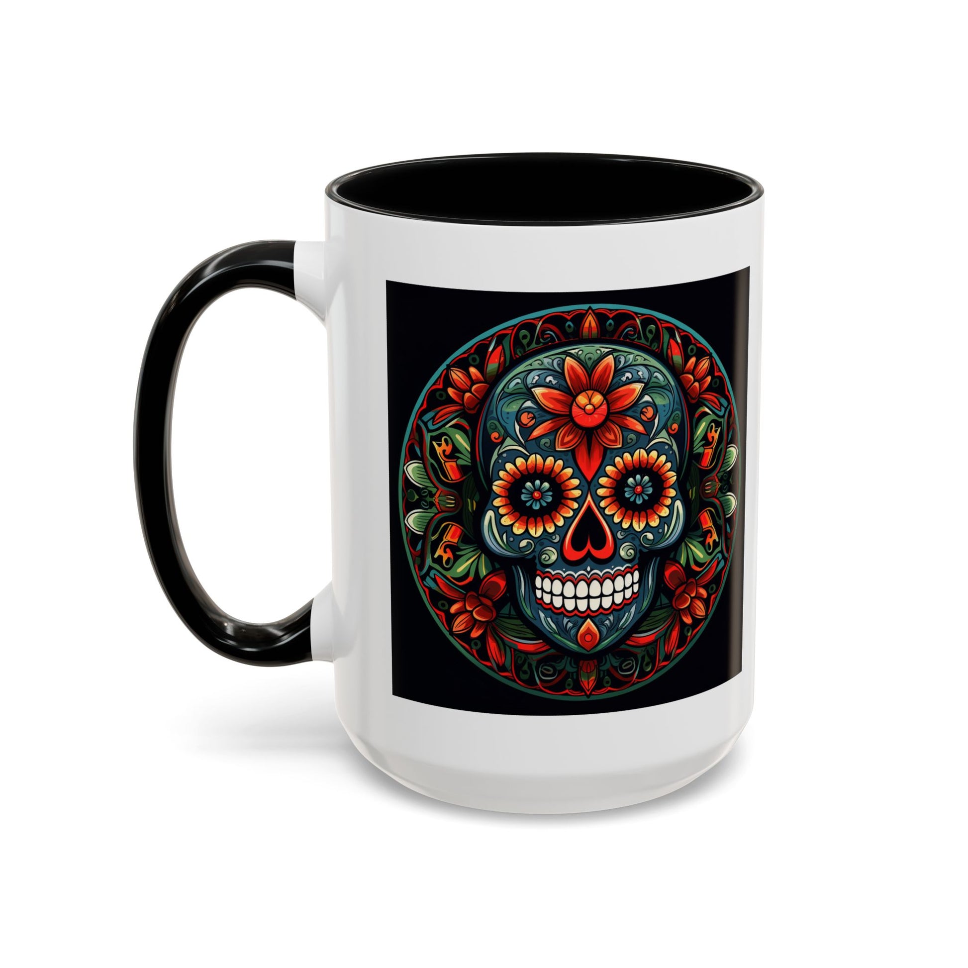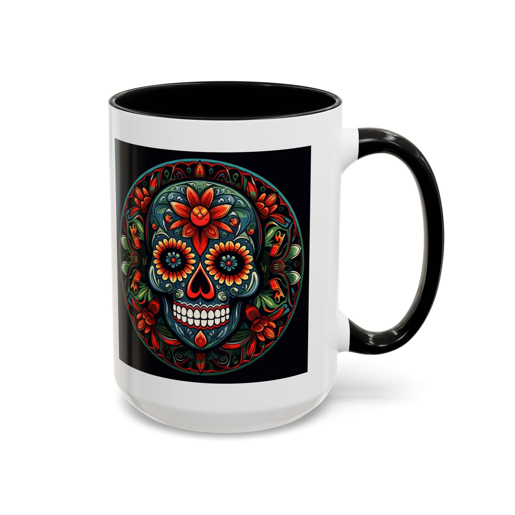 Day of the Dead Mandala Ceramic Coffee Mug (11oz, 15oz) – White Ceramic with Colored Interior & Handle | Glossy Finish & Lead/BPA-Free