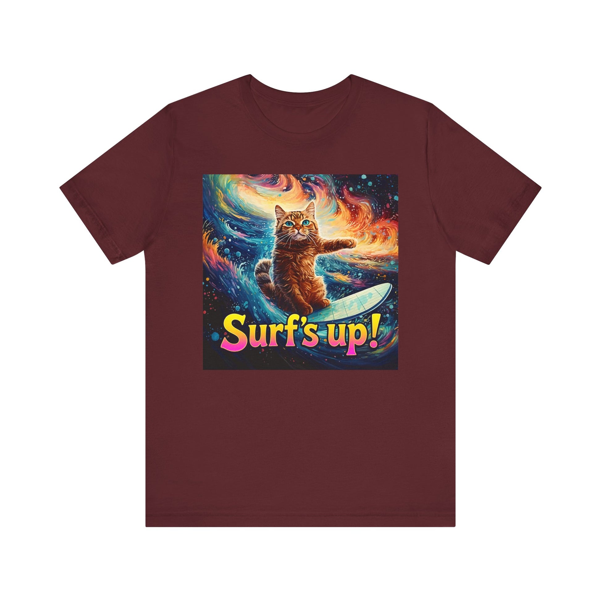 Surf's Up Cat Surfboard T-Shirt - Unisex Jersey Short Sleeve Tee - Funny Surfing Cat Graphic Shirt
