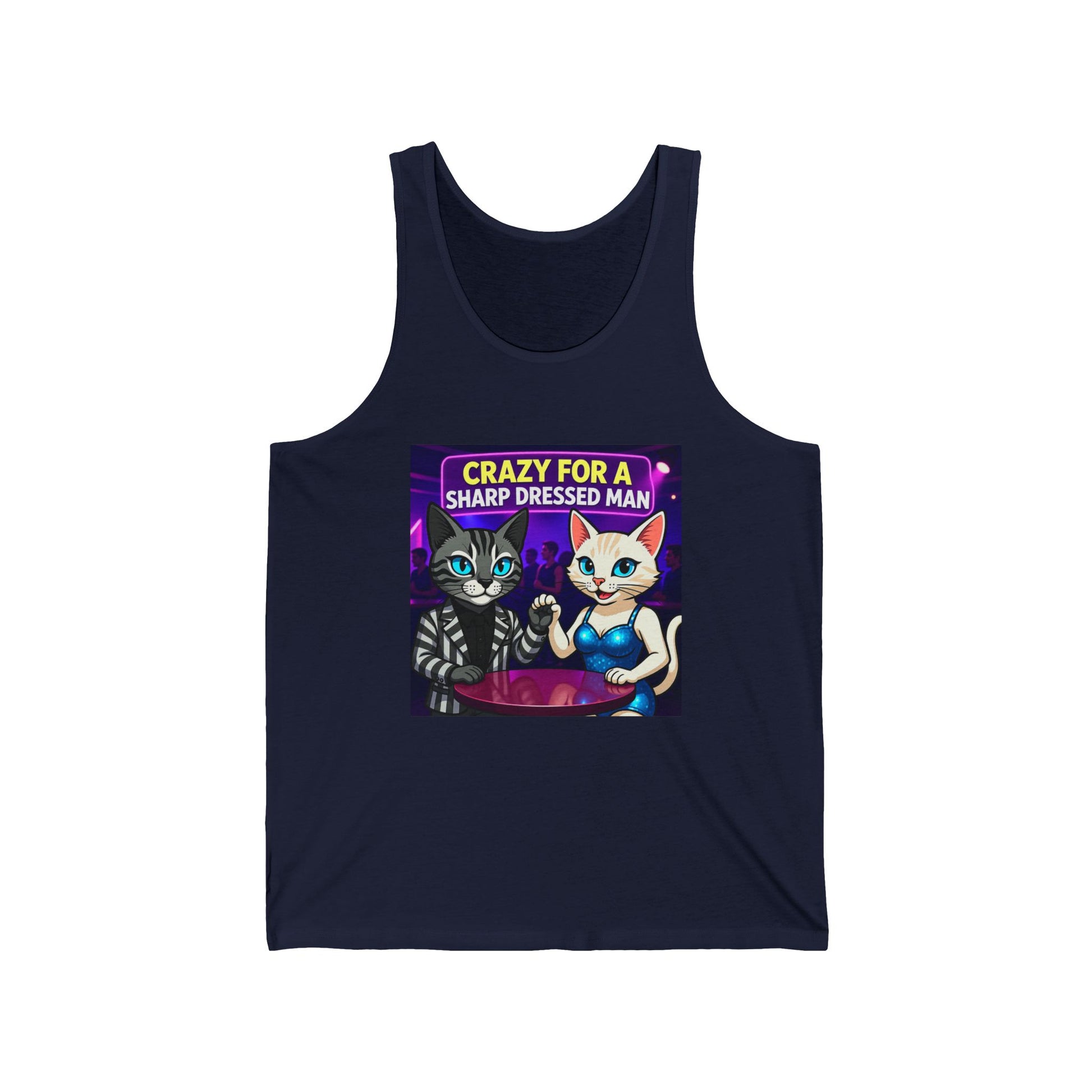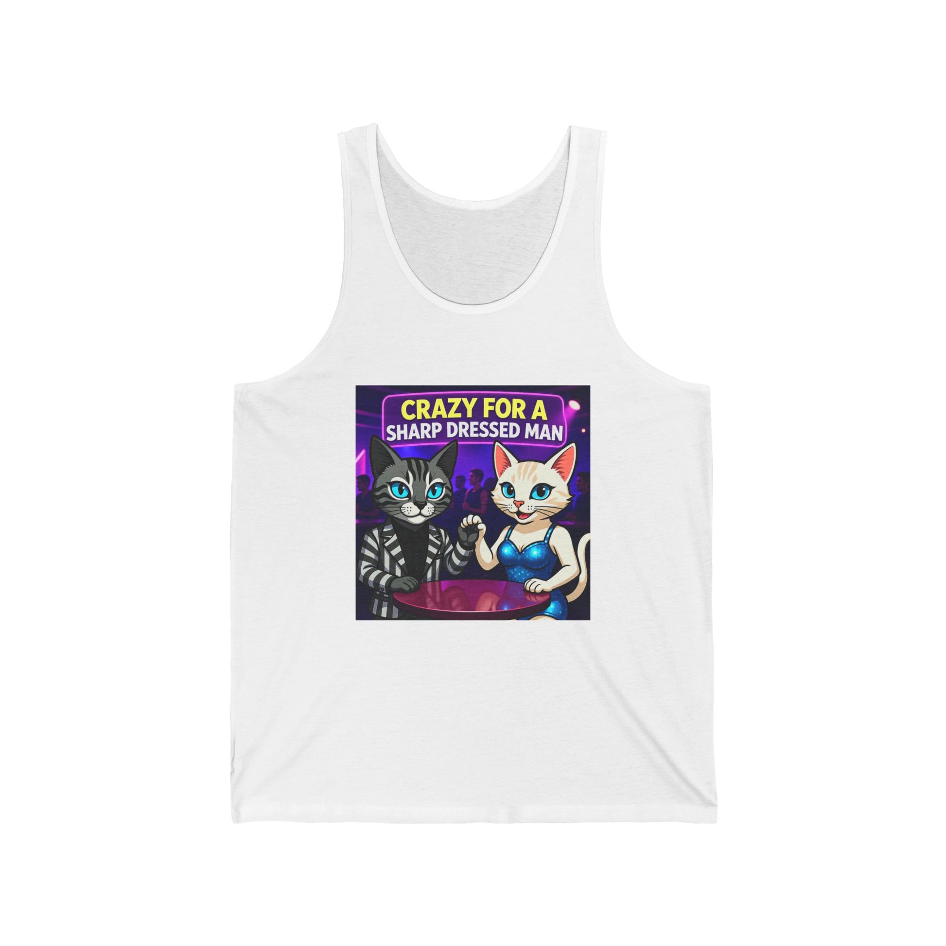 This must-have unisex jersey tank top is a perfect blend of style and comfort, featuring a cheeky design of two cats flirting with each other. The high-quality print ensures it becomes an ultimate statement piece for years to come.