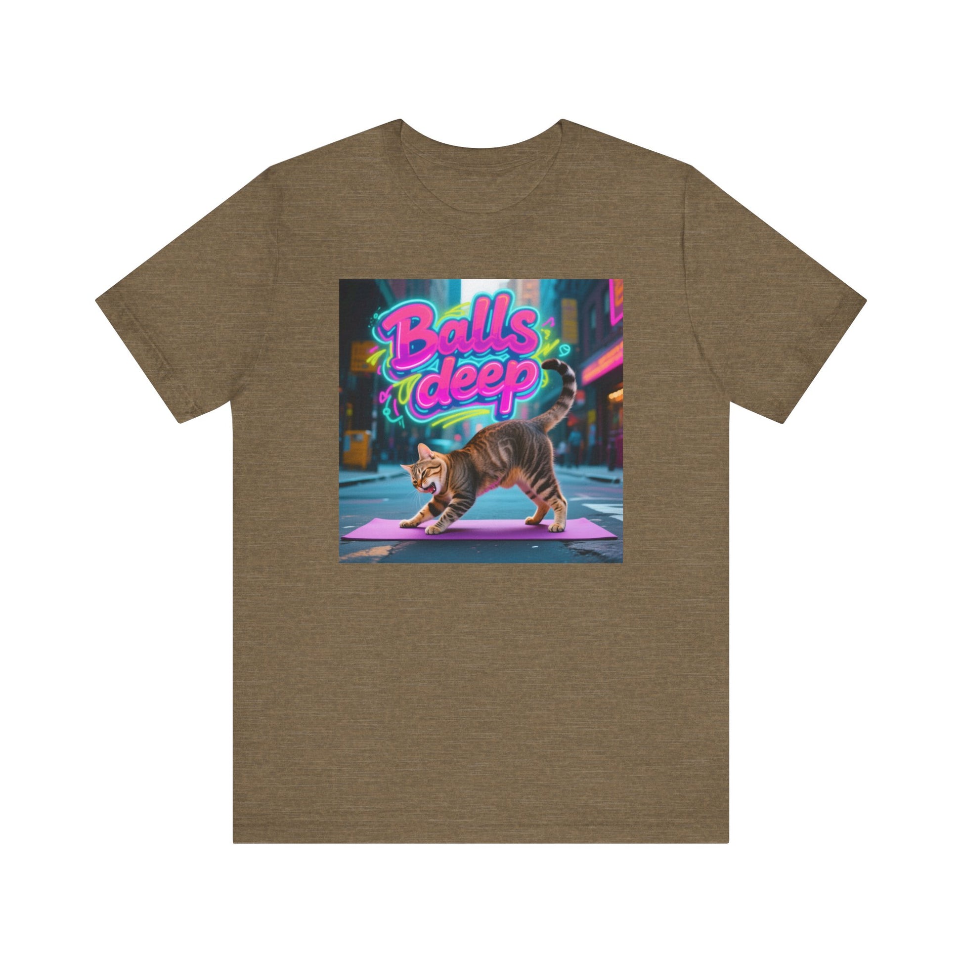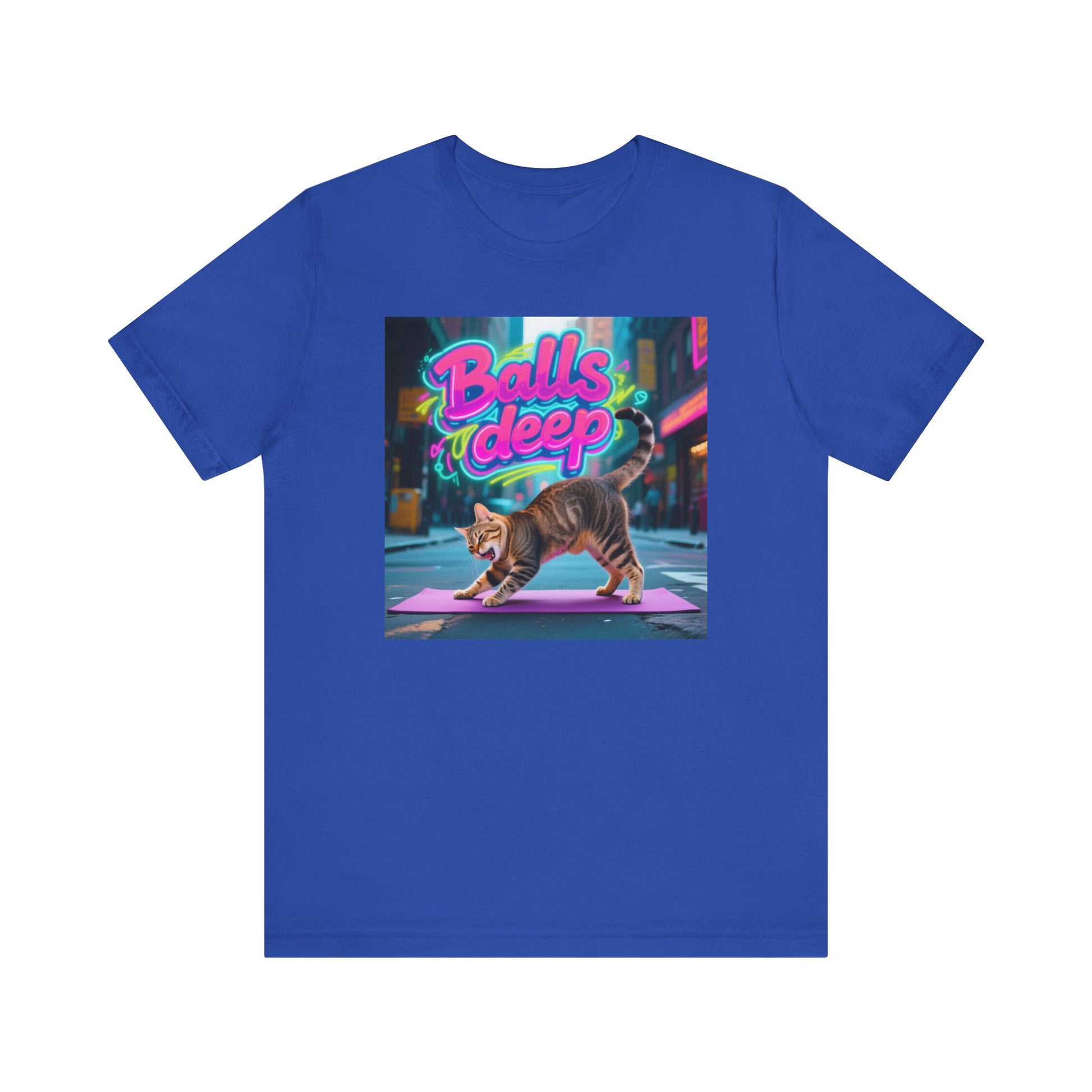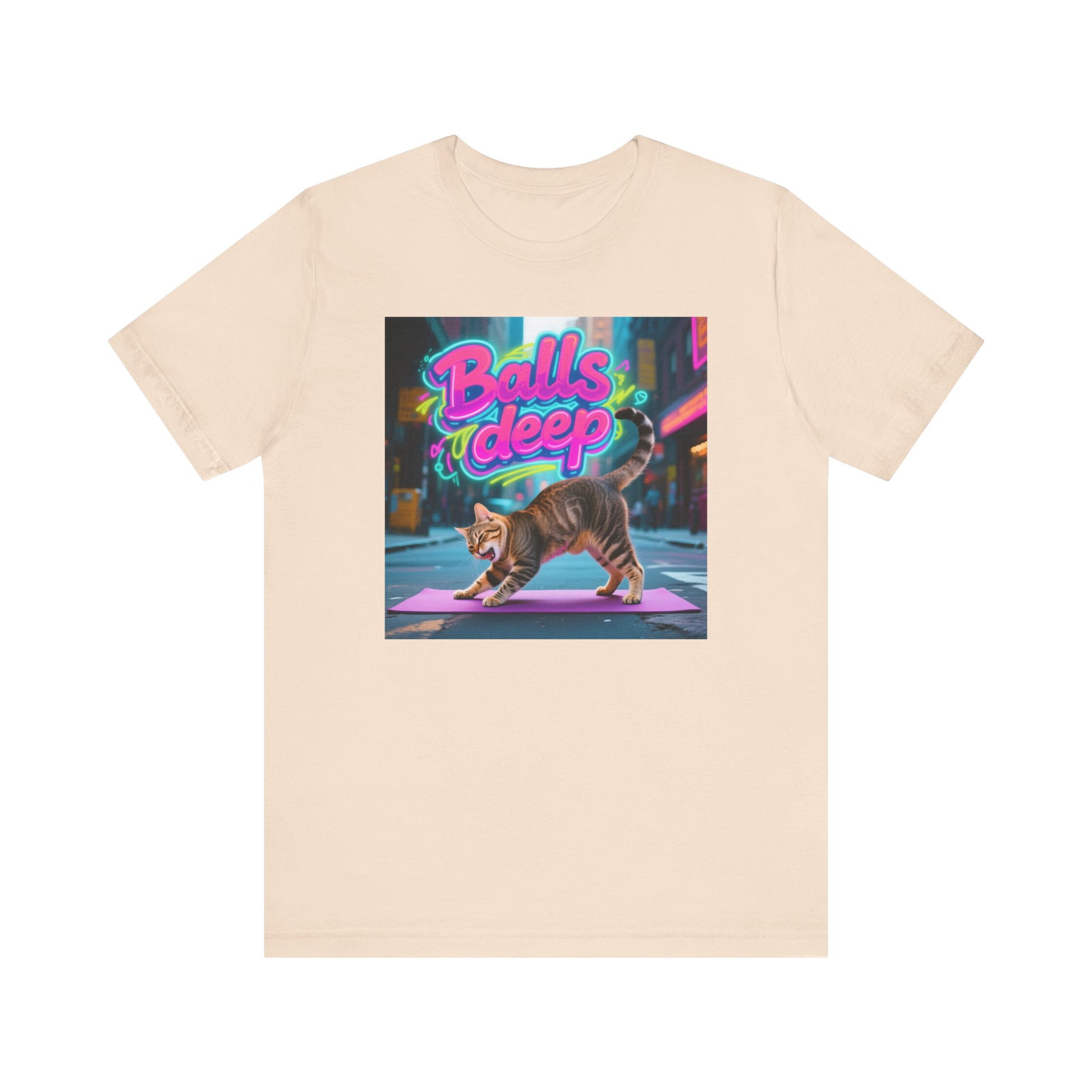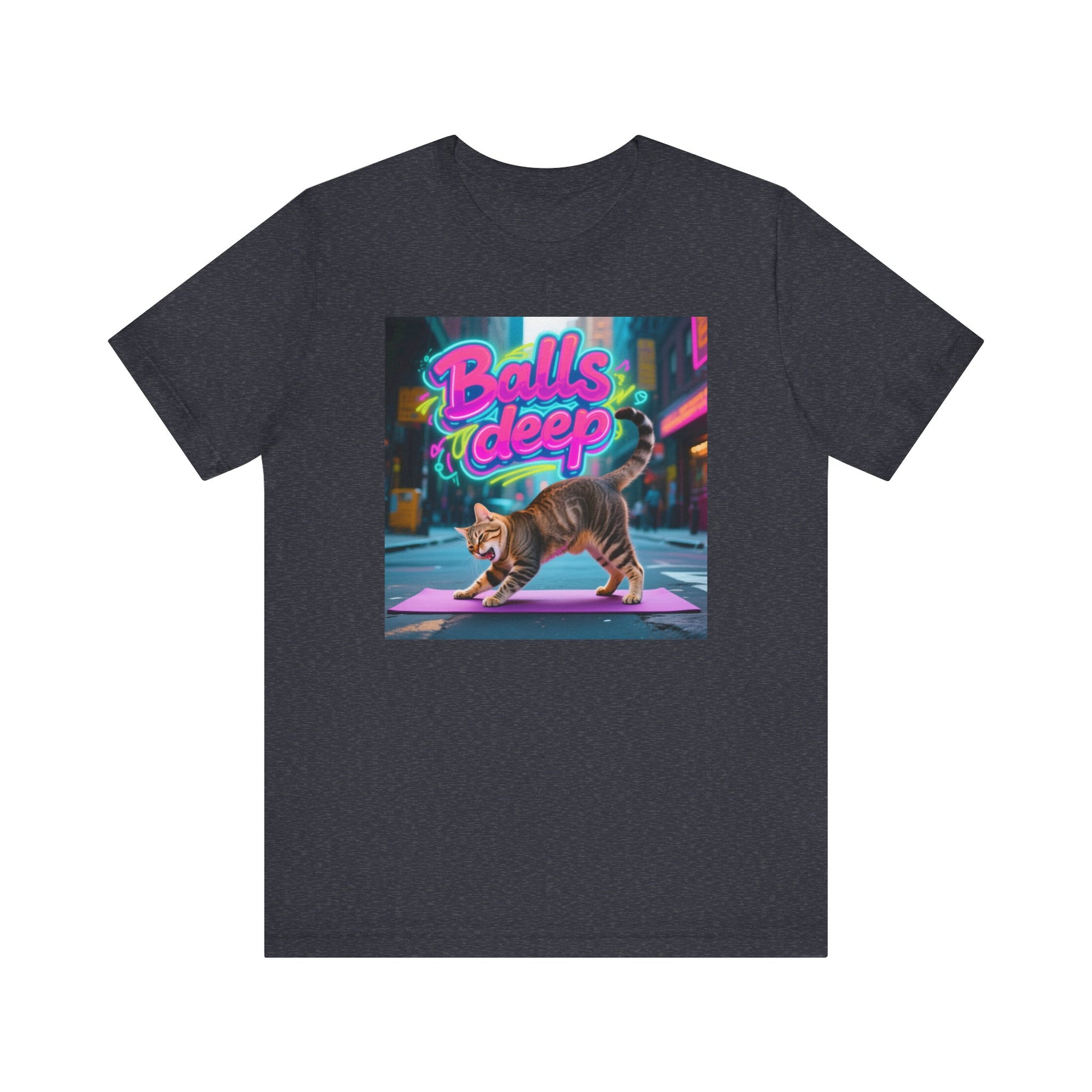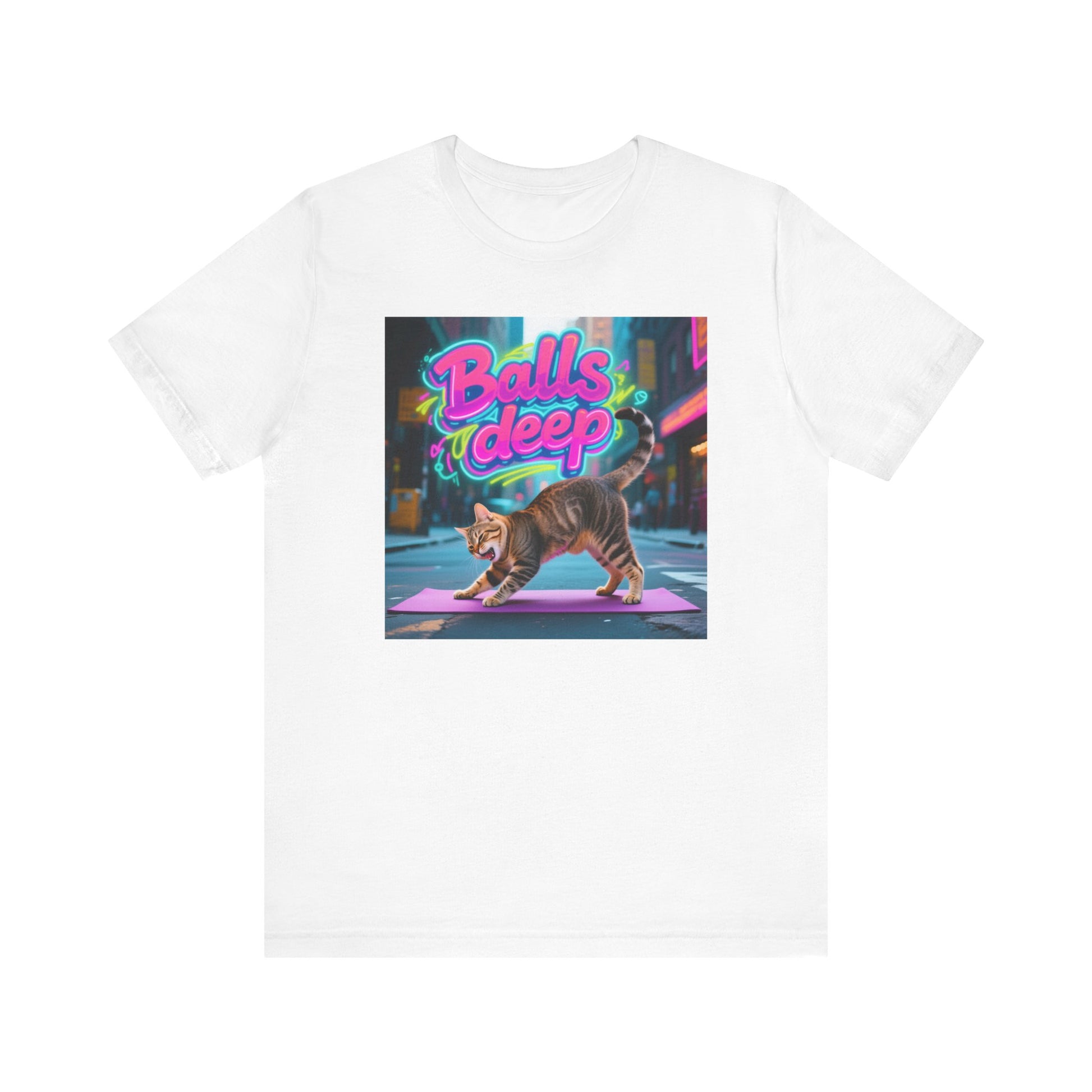 Balls Deep Yoga Cat T-Shirt - Unisex Jersey Short Sleeve Tee - Playful Feline Yoga Graphic Shirt