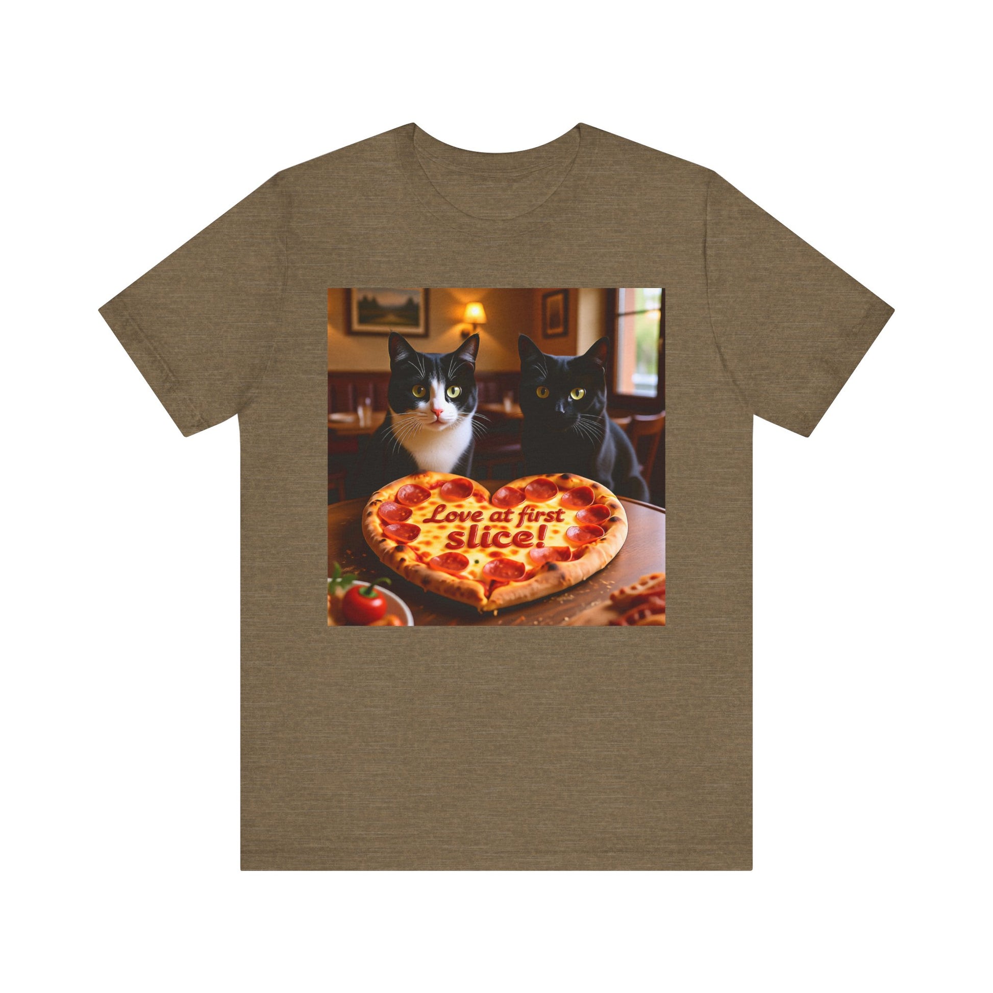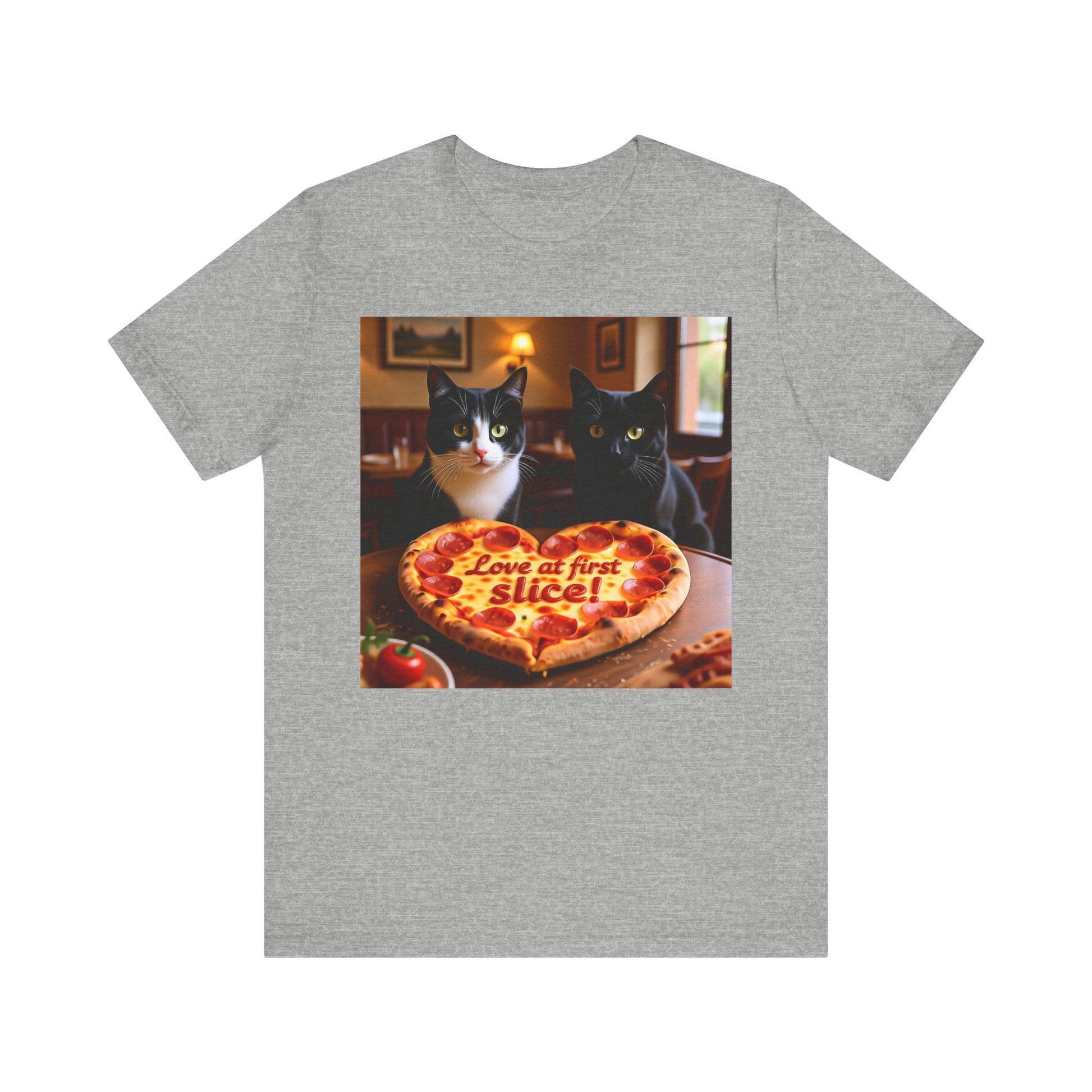 Love At First Slice Cat Pizza Date T-Shirt - Unisex Jersey Short Sleeve Tee - Funny Cat Lover Graphic Shirt